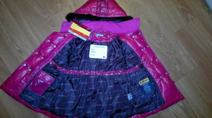 Куртка Гулливер маркировка 110.Состав:80% пуха,20% пера,ткань перламутровая с пропиткой водооталкивающая.Мех кролика.Очень теплая.