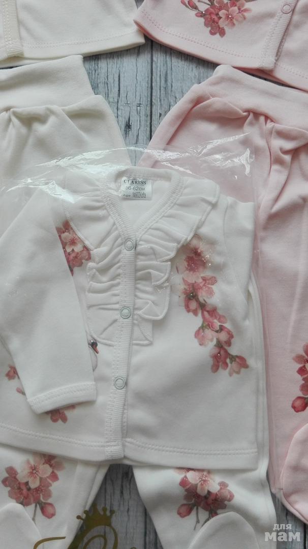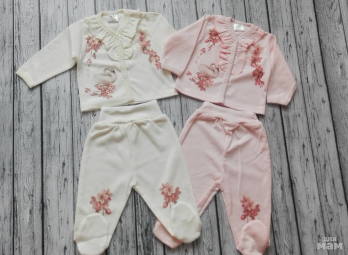 4. Костюм "Цветы и лебеди"- кофточка и ползунки. р. 56 (56-62) подойдет и на р.52, р. 62 (62-68), р. 68 ( 68-74) - Новая цена 430 руб. Красивый комплект.