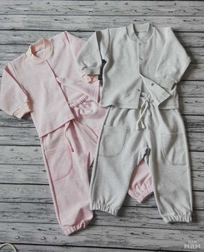 Ткань: интерлок. Состав: хорпок 100%.Цвет: свело-серый ( для мальчика) и светло-бежевый (для девочки).