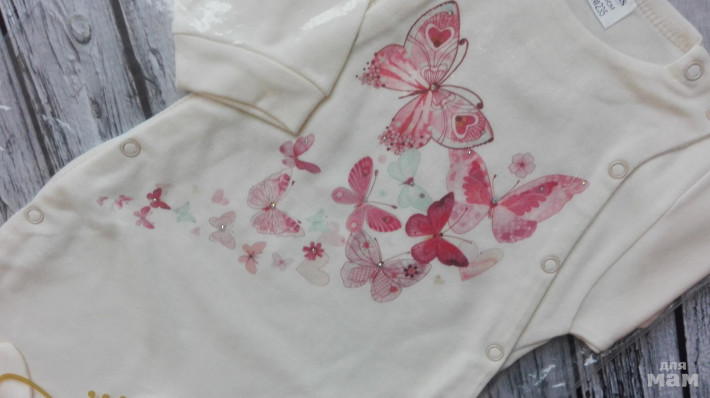 Нарядный и милый комбинезон слип из мягкого трикотажа. Украшен на груди большим красочным принтом с яркими бабочками. Принт выполнен экологически безопасными красками. Дополнительно декорирован сияющими стразиками. Декор крепится при помощи специального оборудования и полностью безопасен, исключена вероятность отрывания и проглатывания мелких деталей. Боковые застежки на кнопочках по всей длине комбинезона с переходом на ножку для быстрого и комфортного переодевания малыша.