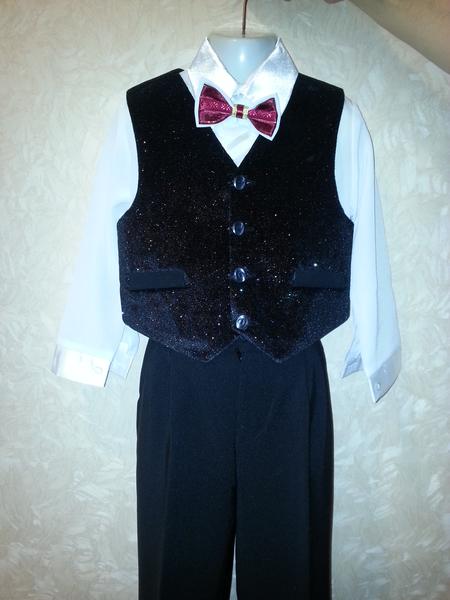 Нарядный черный костюм для мальчика (брюки+жилет+рубашка + бабочка) в идеальном состоянии. Надевали 1 раз на выпускной в садике. Рубашка (тоненький креп-жоржет с атласной отделкой) и бабочка новые, с этикетками. Галстук в цвет костюма в подарок.