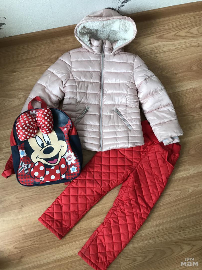 - Пудровая куртка Next, красные стеганые брюки, рюкзак.