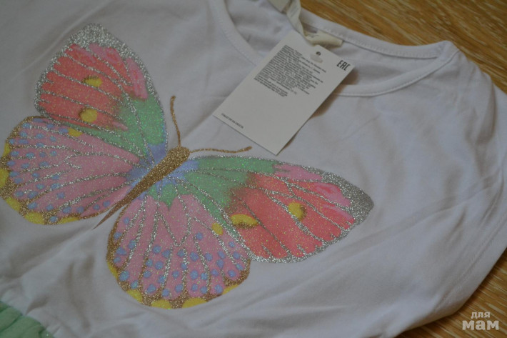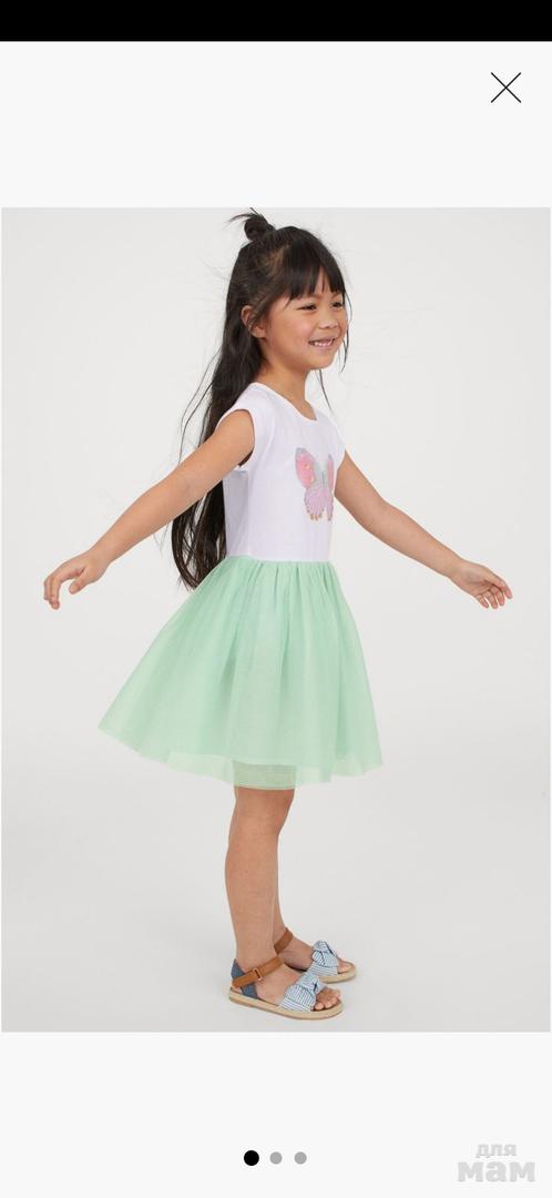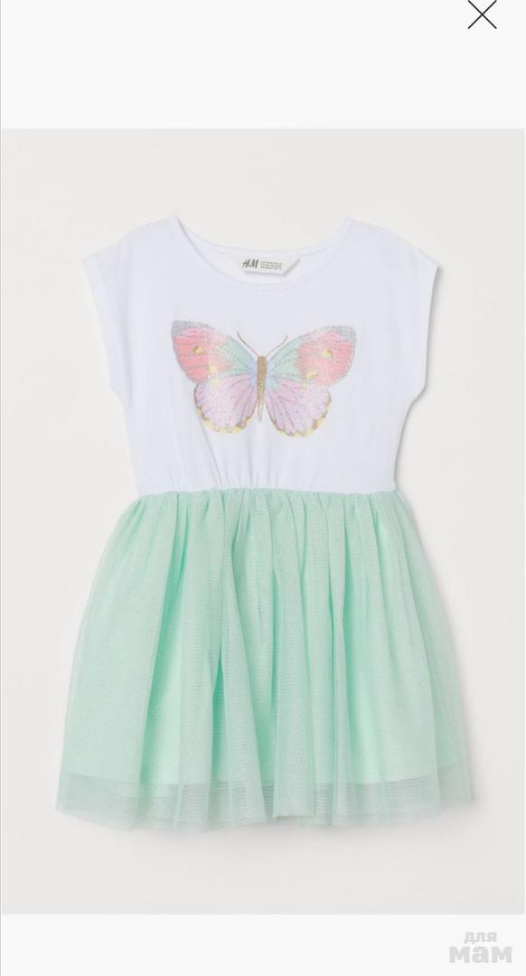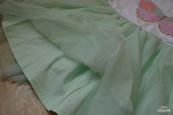 Новое с биркой, очень нежное, красивое. Два слоя фатина, верхний с блеском, подкладка трикотажная, бабочка с блестками. В размер, на рост от 122см., дочке оказалось велико на рост 117см.