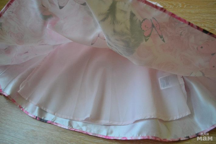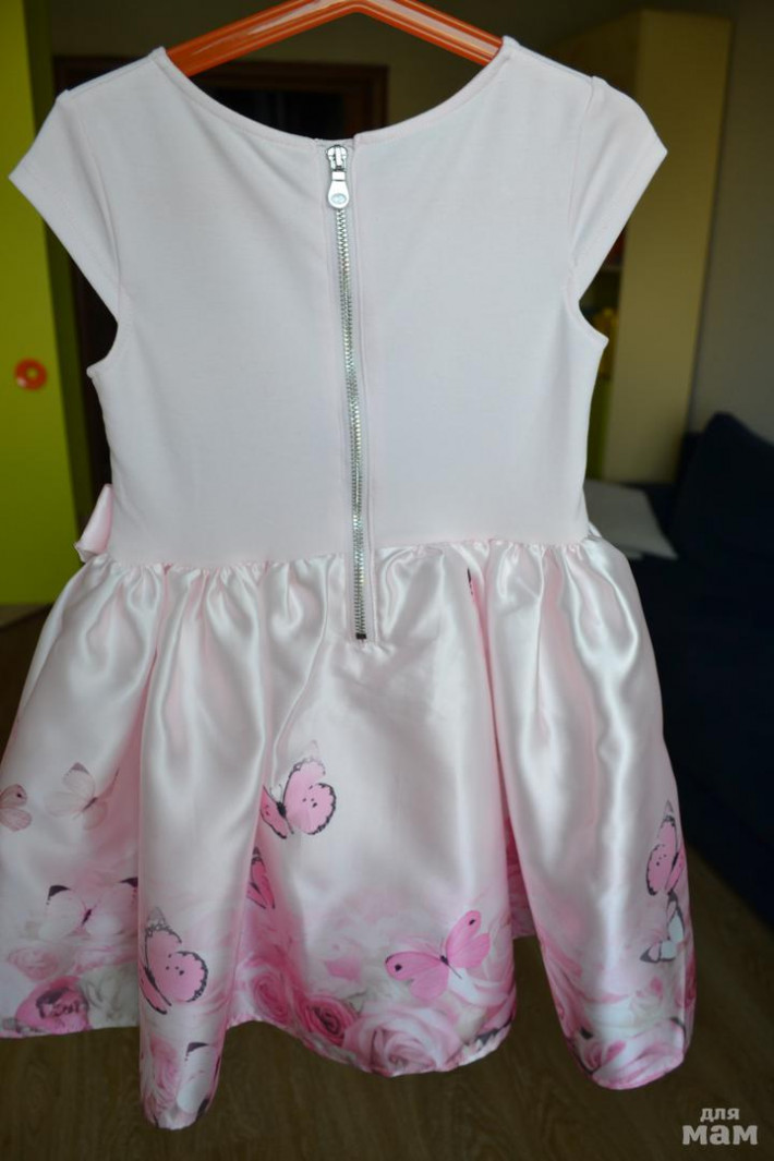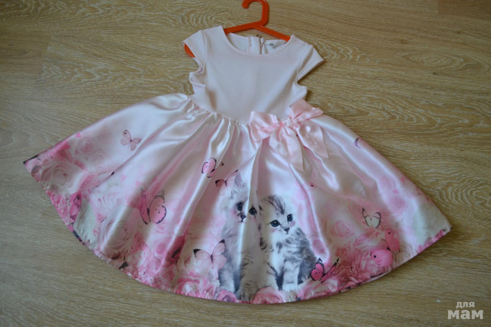 Платьице нежно-розового цвета, принт бабочки, розы, котики. Размер 110-116, но сядет хорошо оно при росте ближе к 116см., конечно зависит от комплекции девочки, но вот на моей дочке оно село только при росте 114см. До этого примеряли, как то не очень смотрелось, в талии болталось. Одето один раз на утренник Низ очень пышный, материал плотный атласный, есть подкладочка. Цена 800р.