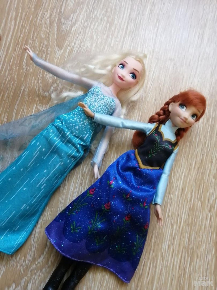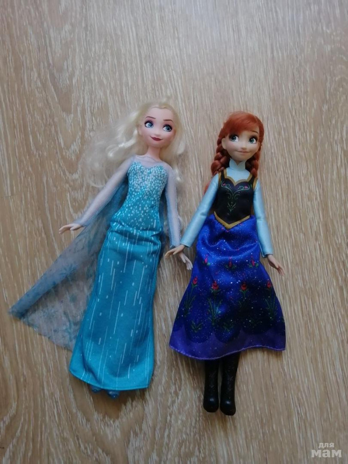 Оригинальные куколки фирмы Хасбро. Анна и Эльза. Без звуковых эффектов, ножки не сгибаются в коленях, только сидеть могут. Руки сгибаются в плечах, голова поворачивается. У Анны платье и сапожки, у Эльзы платье со шлейфом и туфельки. Состояние отличное, большую часть времени сидели на полке. Каждая куколка стоила 1500р.