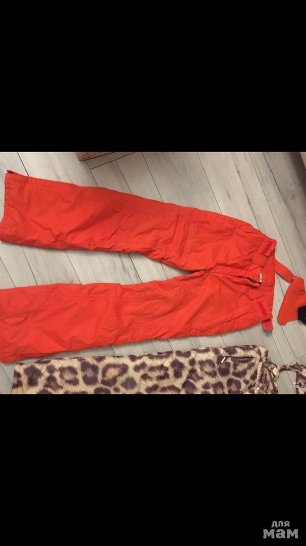 Зимние очень тёплые штаны фирмы Les Trois Vallees, маркировка 11 лет, шаговый 72 см, на коленке есть порез, спрятан, все остальное в отличном состоянии, горнолыжные брюки полукомбинезон яркого, терракотового цвета, шаговый 71, маркировка 152, фирма Glissade. В очень хорошем состоянии.