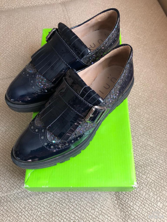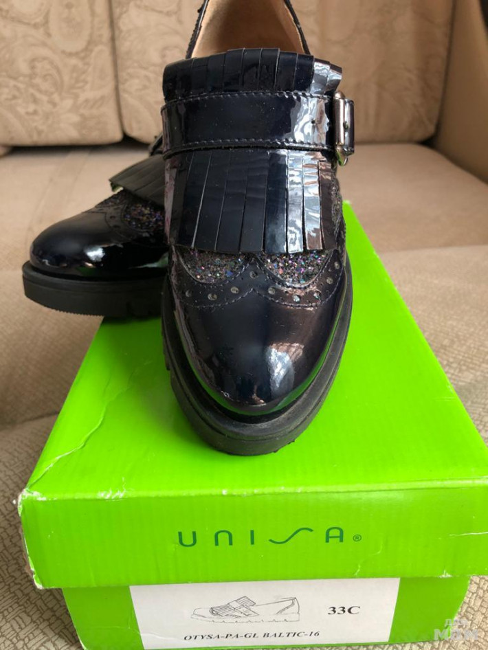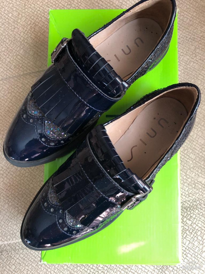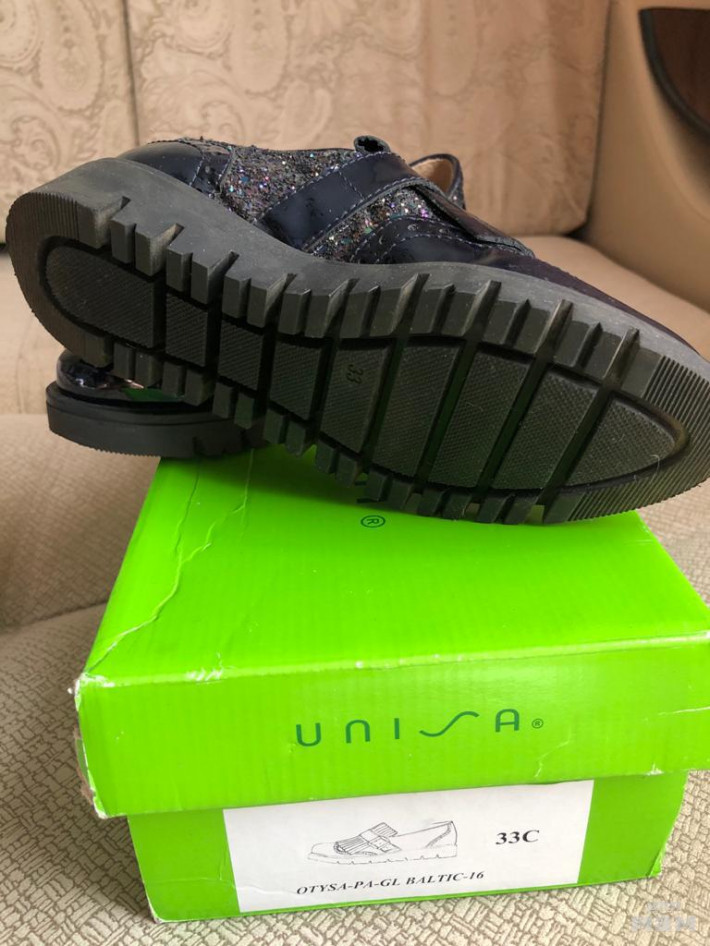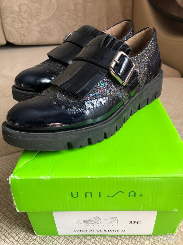 Продам крутые туфли итальянской марки Unisa, размер 33 полнота С. В идеальном состоянии. Были куплены в Италии, носили от силы 5 раз, стали маловаты. Красивого глубокого синего цвета с переливом, натуральная лаковая кожа + глиттер, стелька кожаная. Очень удобная колодка.