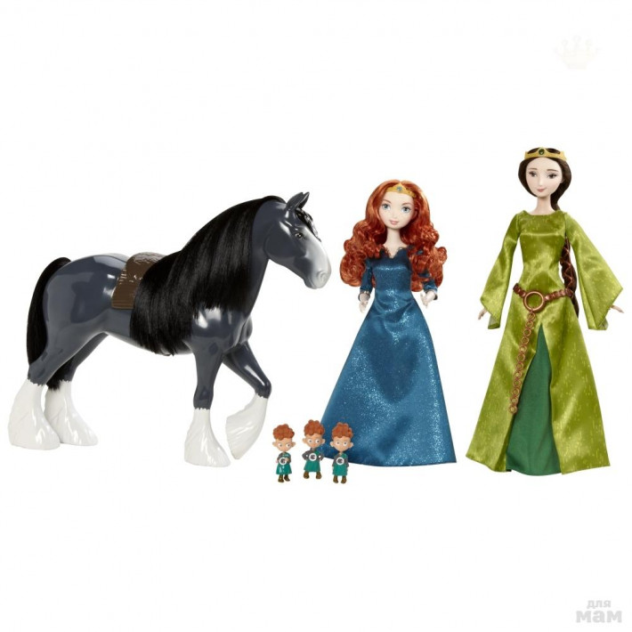 Кроме куклы Мериды в набор входят три ее брата, королева Элинор и верный друг Мериды конь Ангус. Все куклы имеют точное сходство с героем мультфильма вплоть до мельчайших деталей, поэтому играть с ними приятно вдвойне.