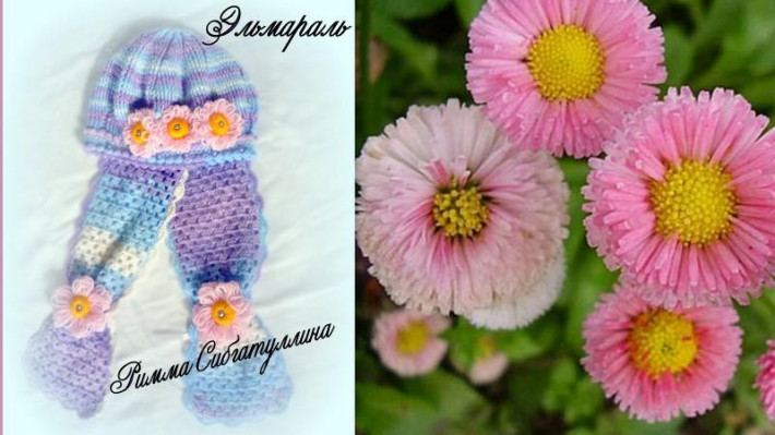 Шапочка и шарфик на девочку связан из полушерстяной детской пряжи.Шапка и шарф украшены нежными цветочками .С удовольствием повторю свою работу.