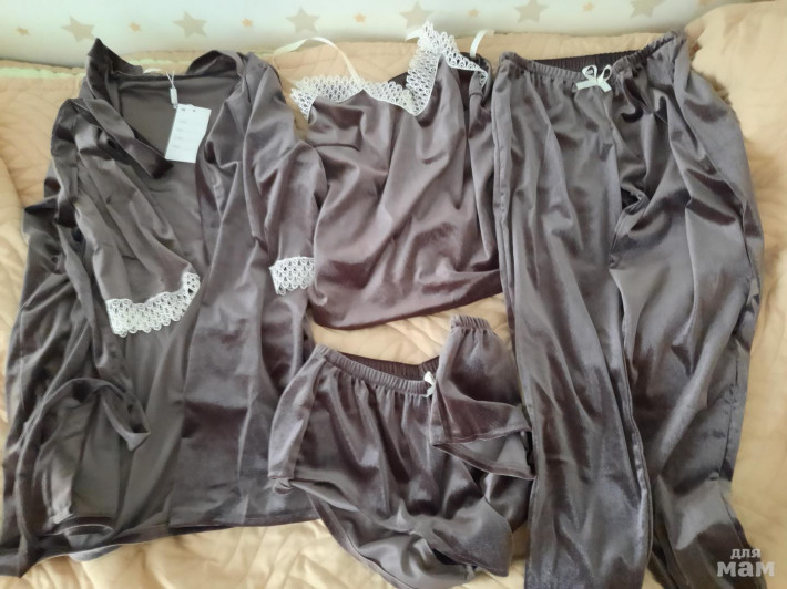 Комплект домашний. Очень класный, и цвет а цена вообще. Майка по линии вытачек (сзади резинка и по подмышкам сложно) 42. Шорты талия по резинке 33, бедра по самой широкой части, тоже в форме сердца 47. Штаны талия по резинке 31, бедра не растягивая, как положила их 42. Халат длина по спине 74, по подмышкам со стороны спины 52. Он очень суперский