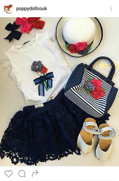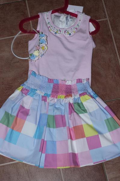 Блузка розово-белая. Сзади на шее завязывается бант.