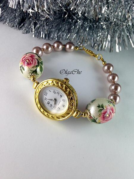 Нежные наручные часы, выполнены с использованием бусин Тенша ручной работы, жемчуга майорки и позолоченной фурнитуры. Размер регулируется по желанию цепочкой.