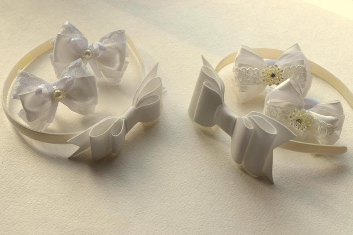 Не смогла настроить фотоаппарат(( Знаю что некоторым нужны именно молочные бантики под молочные блузки, вот в качестве примера резиночки и ободки. Ободочки - фоамиран, резиночки - атлас, кружево, органза.