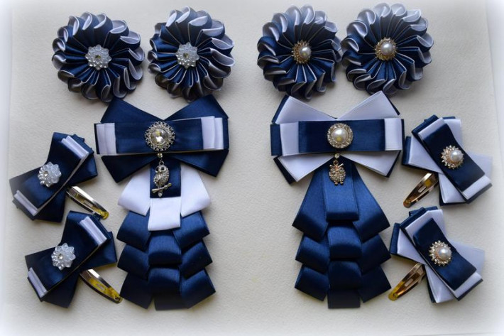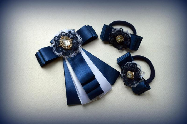 Девочки, есть такой набор. Шикарный!!! Для подарка на последний звонок или 1 сентября. Цена всего 1000 р с почтой и завтра уже отправка. Пока у меня его на ярмарку не забрали. Правда, очень красивущий!! Длина галстучка 15 см, ленты все в тон, белая атласная с переплетением в модную клетку.