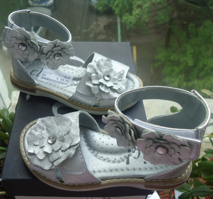 Босоножки полностью кожаные цвет серебро 22р-р спереди регулируются липучкой,застёжка тоже липучка.в каждом цветочке стразик ) полностью кожаная стелька 13.6 см,Высокий берц,очень удобные