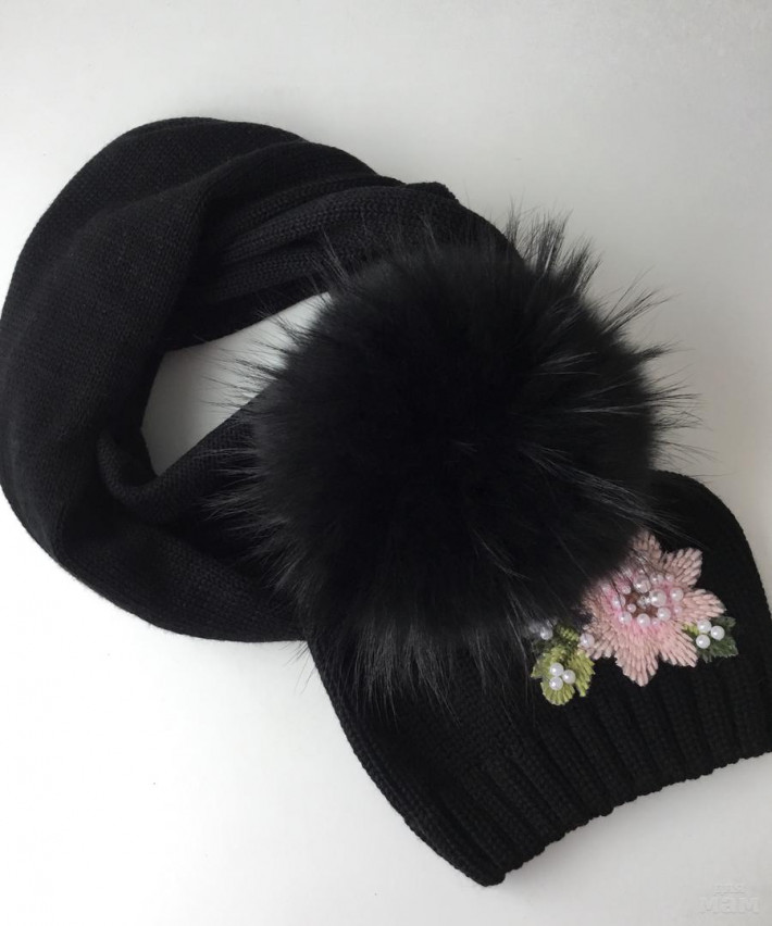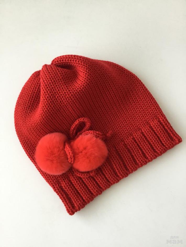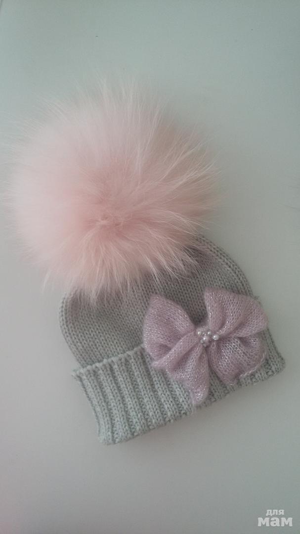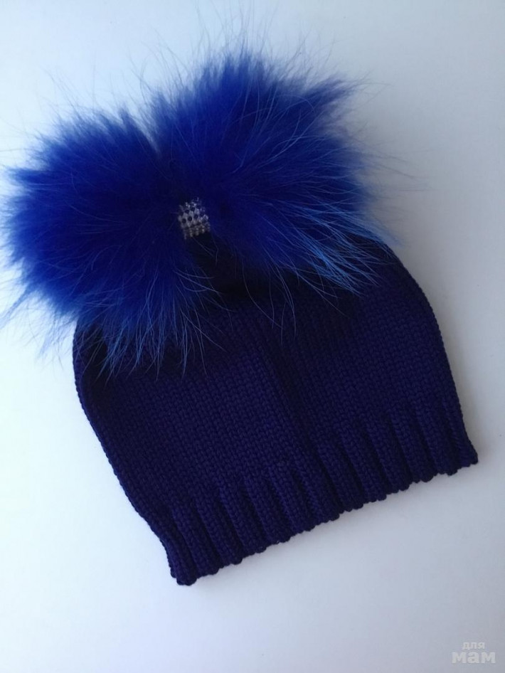 Помпошки натуральный кролик, шапка в две нити