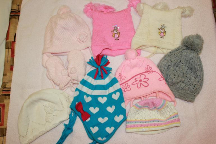 Все шапки носили где то с 4-5 мес до 9-10мес. Верхний ряд- две одинаковые шапки розовая и кремовая по 150 руб. розовая шапка с рисунком цветочек -150 руб.
