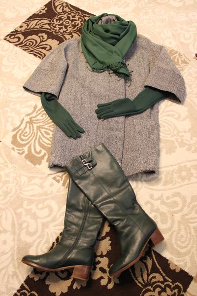 Купила по вашему, девочки, совету-зеленые перчатки, шарф и к нему перчатки цвета марсала). До кучи еще одни черные-пригодятся! и порылась у себя в шкафу) Вот, что получилось