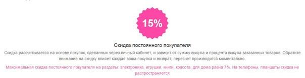 Моя скидка постоянного покупателя в магазине на данный момент выросла до 15 % (может уменьшиться при отказе от заказов), распространяется на многое, но есть исключения. Максимальная скидка постоянного покупателя на разделы: электроника, игрушки, книги, красота, для дома равна 7%. На телефоны, планшеты скидка не распространяется.