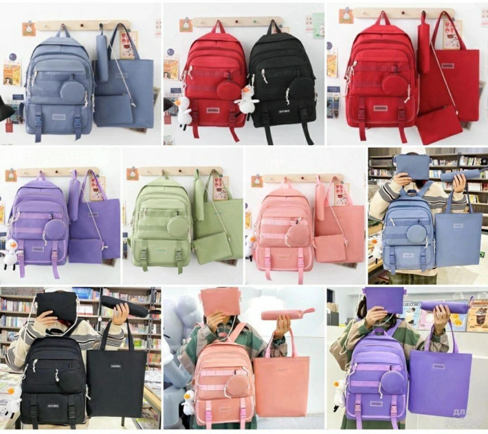В комплекте 5 в 1 и 4 в 1Рюкзак + шопер + сумка маленькая + пинал,сумка для мелочи.Материал текстильКачества Супер Размер: 42/28/18см
