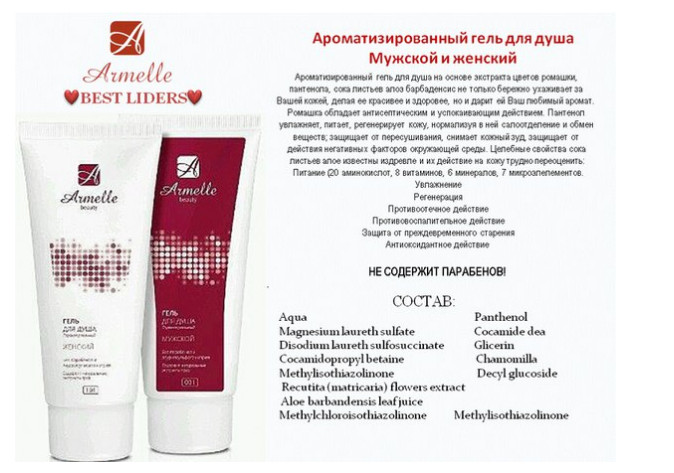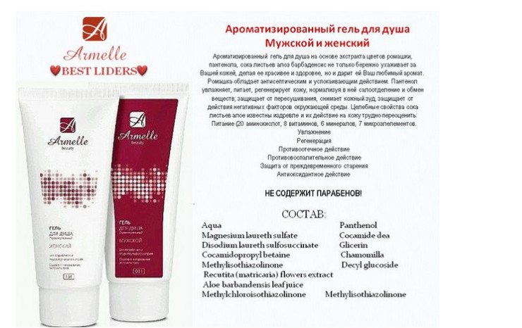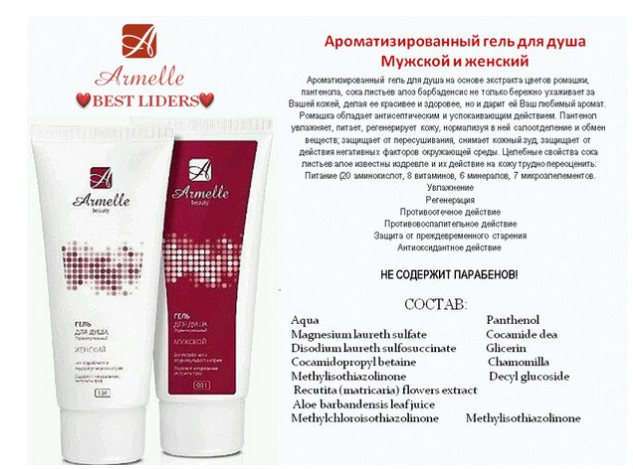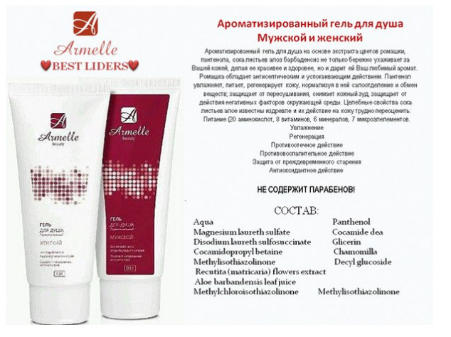 Ароматизированный гель для душа на основе экстракта цветов ромашки, пантенола, сока листьев алоэ барбаденсис не только бережно ухаживает за Вашей кожей, делая ее красивее и здоровее, но и дарит ей Ваш любимый аромат. Ромашка обладает антисептическим и успокаивающим действием. Пантенол увлажняет, питает, регенерирует кожу, нормализуя в ней салоотделение и обмен веществ; защищает от пересушивания, снимает кожный зуд, защищает от действия негативных факторов окружающей среды. Целебные свойства сока листьев алое известны издревле и их действие на кожу трудно переоценить: