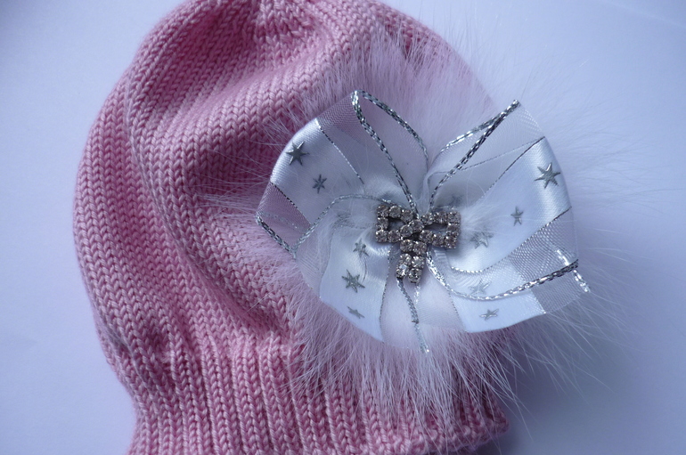 Украшен перистым меховым помпоном из енота и бантиками из страз.