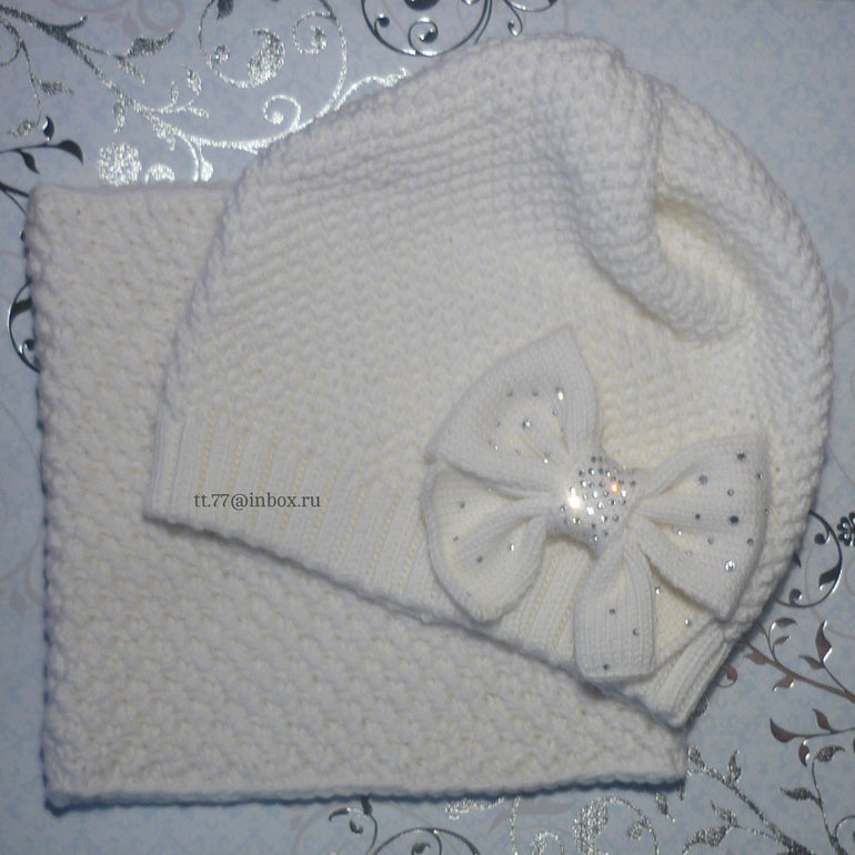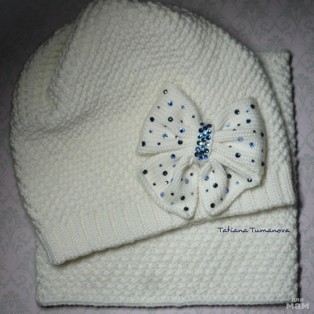 Комплект: шапочка + снуд. Шапочка украшена бантом и стразами в синих тонах.