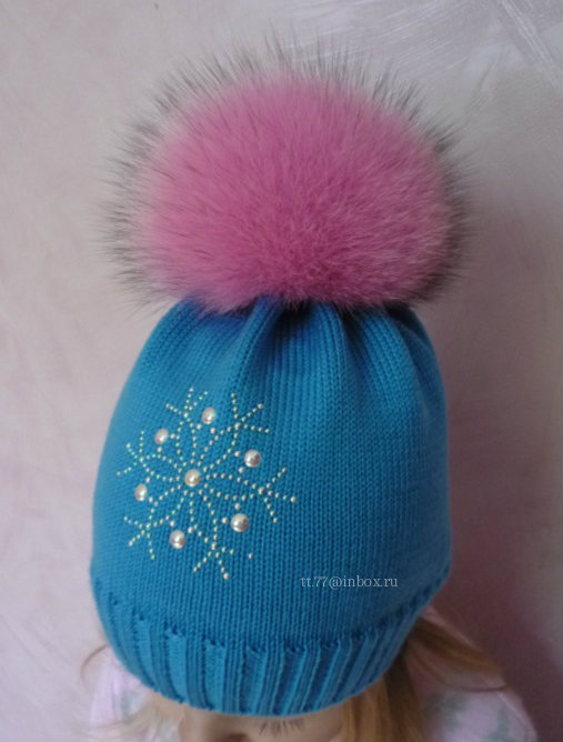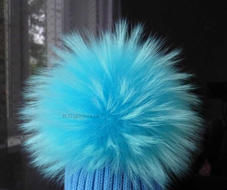 Вы так же можете отдельно в дополнение к шапочки приобрести меховым помпоном из финского енота в голубом цвете (он на фото). В наличии есть и в белом и в сером и в других цветах меховые помпоны из енота и из песца. Уточняйте пожалуйста
