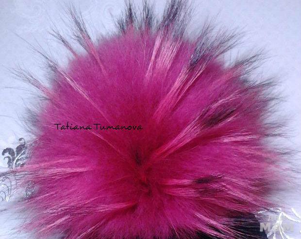 Украшен перистым меховым помпоном из енота в цвете яркая фуксия. Его реальный цвет не передался к сожалению.