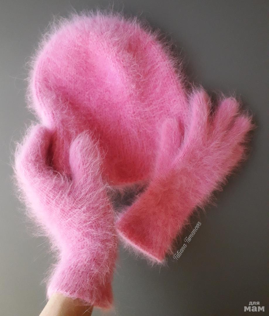 Комплект шапочка и перчатки из ангоры в розовом цвете.