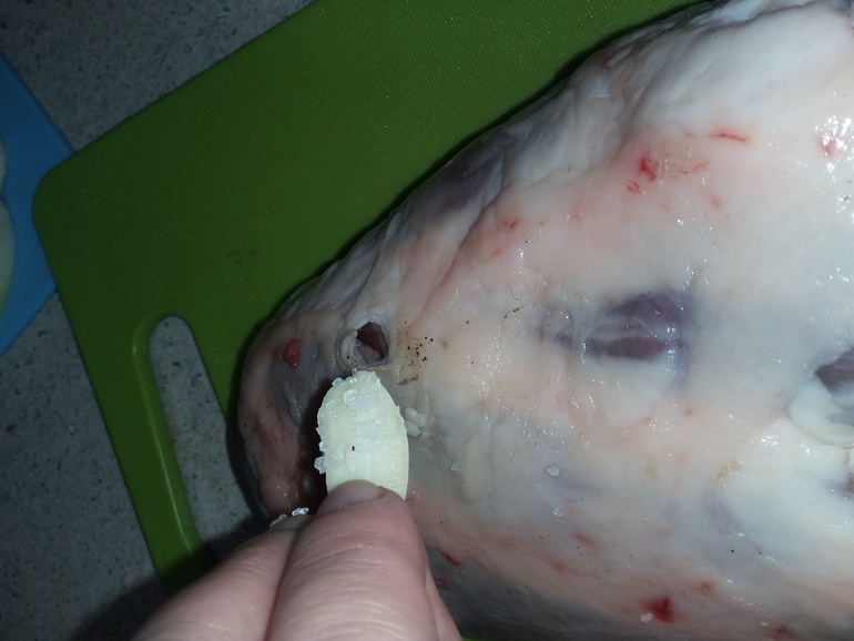 Сделать в мясе проколы. Обмакнуть чеснок в соль, вставить: