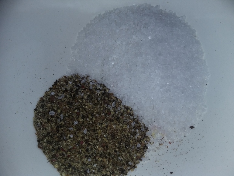 Еще головку чеснока натереть и смешать с солью и свежемолотым черным перцем: