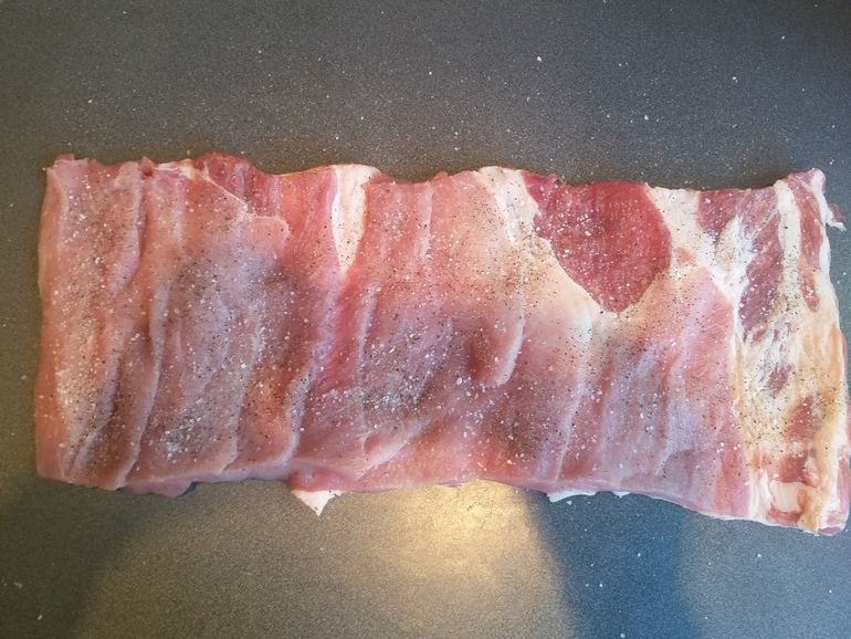 Так и срезанный большой кусок мякоти, который солим и перчим свежемолотым черным и душистым перцем: