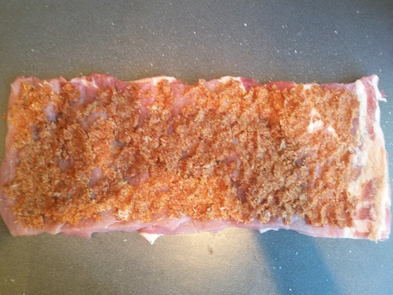 Получившейся кашицей обмазываем свинину со всех сторон:
