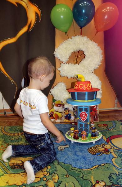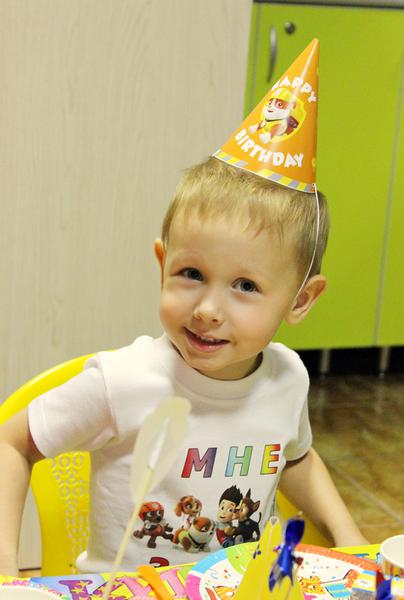 В связи с выходом на работу, времени на подготовку было совсем мало, не то что в прошлом году...распечатала колпачки, маски, приготовили именинную футболку, заказали торт, тройку облепили с мужем за час до выхода))..Тема праздника была выбрана по любимому мультфильму "Щенячий патруль". Егор - фанат патруля..Себя зовет - Крепыш, меня - Скай, папу - Райдер
