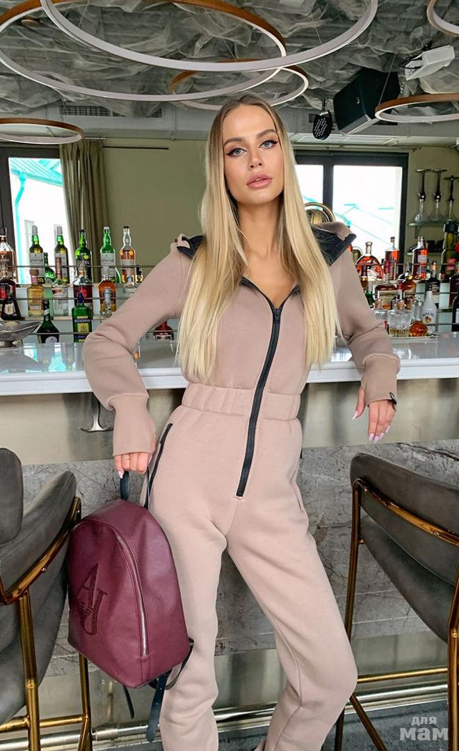 Комбинезон женский прилегающего силуэта втачного покроя. Застежка центральная на тесьму-молнию. Карманы с тесьмой-молнией. Рукава длинные с манжетой-перчаткой, на левом рукаве силиконовая нашивка с фирменным логотипом. Приталивание создается за счет притачной тесьмы-молнии с изнаночной стороны, шириной 60мм. Горловина обработана двойным капюшоном, переходящим в стойку. Верхний капюшон состоит из трех частей, с отделкой в виде ушек. Нижний капюшон из двух чатей, контрастного цвета. Низы брюк на манжетах.