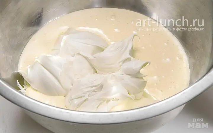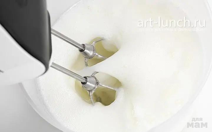 Белки взбиваем с щепоткой соли до устойчивых пиков, на это может уйти примерно 3-7 минут, в зависимости от мощности миксера. Обязательно используйте для взбивания белков чистые ёмкость для взбивания и венчики, если хоть немного желтка или другого жира попадёт в белки, они могут не взбиться.