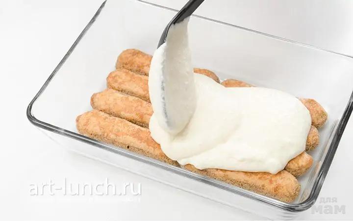 Сверху на слой Савоярди выкладываем примерно половину крема, разравниваем.