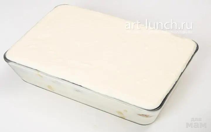 Пропитанные кофе палочки выкладываем на дно формы. Здесь вы можете использовать большую форму, как у меня, а можете взять маленькие формочки или стаканы и делать в них десерты сразу на одну порцию. Мне второй вариант нравится меньше, потому что тогда весь холодильник будет заставлен кучей формочек, зато подавать их, конечно, проще. Кстати, моя форма размером 17х26 см, высота 5,5 см.
