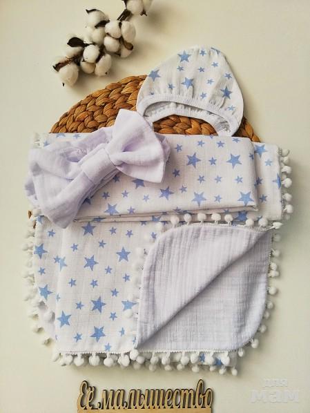 Набор на выписку для малыша в летнюю жаркую погоду выполнен из муслина.Набор состоит из пледа 2 стороннего,банта на липучке и чепчика.Хлопок 100%