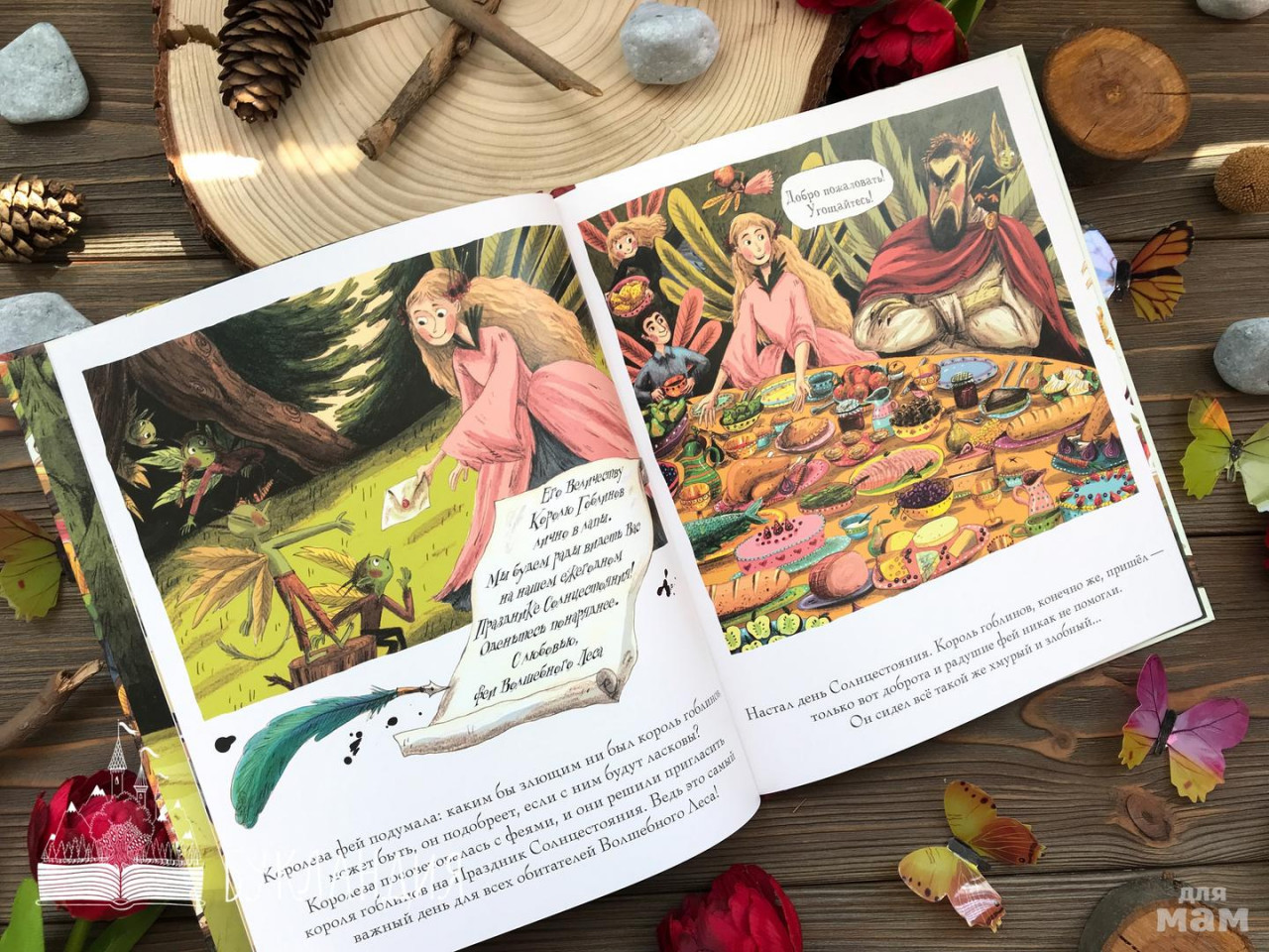 Брайони Мэй Смит, как всегда, очень красиво рисует природу. Зёлень травы сочетается с яркостью диких растений. Деревья, словно живые, протягивают к читателям руки-ветви, а красные мухоморы своими глазами-пятнами, как будто смотрят на приключения героев сказки. Лесные феи изображены в виде маленьких мальчиков и девочек с крыльями, как у бабочек и стрекоз. А Королева фей напоминает классическую сказочную принцессу, которую нужно спасти от злодея. Король гоблинов с зелёными листьями за спиной, напоминающими крылья дракона, не пугает, а, скорее, вызывает неприязнь. Его длинный зелёный нос, мелкие хищные зубы и лицо со злым или недовольным выражением резко выделяются на фоне красивой природы волшебного леса. Даже внешность Короля гоблинов нарушает красоту и гармонию окружающего мира. Я уже не говорю, о его хулиганских поступках и жадности. Король гоблинов выбивается из общей счастливой картины. И только в финале злой великан становится органичной частью природы: он превращается в маленького розового червяка, который всего боится. А природа помогает червячку спрятаться. Ведь всё маленькое и безобидное сразу же попадает под её защиту.