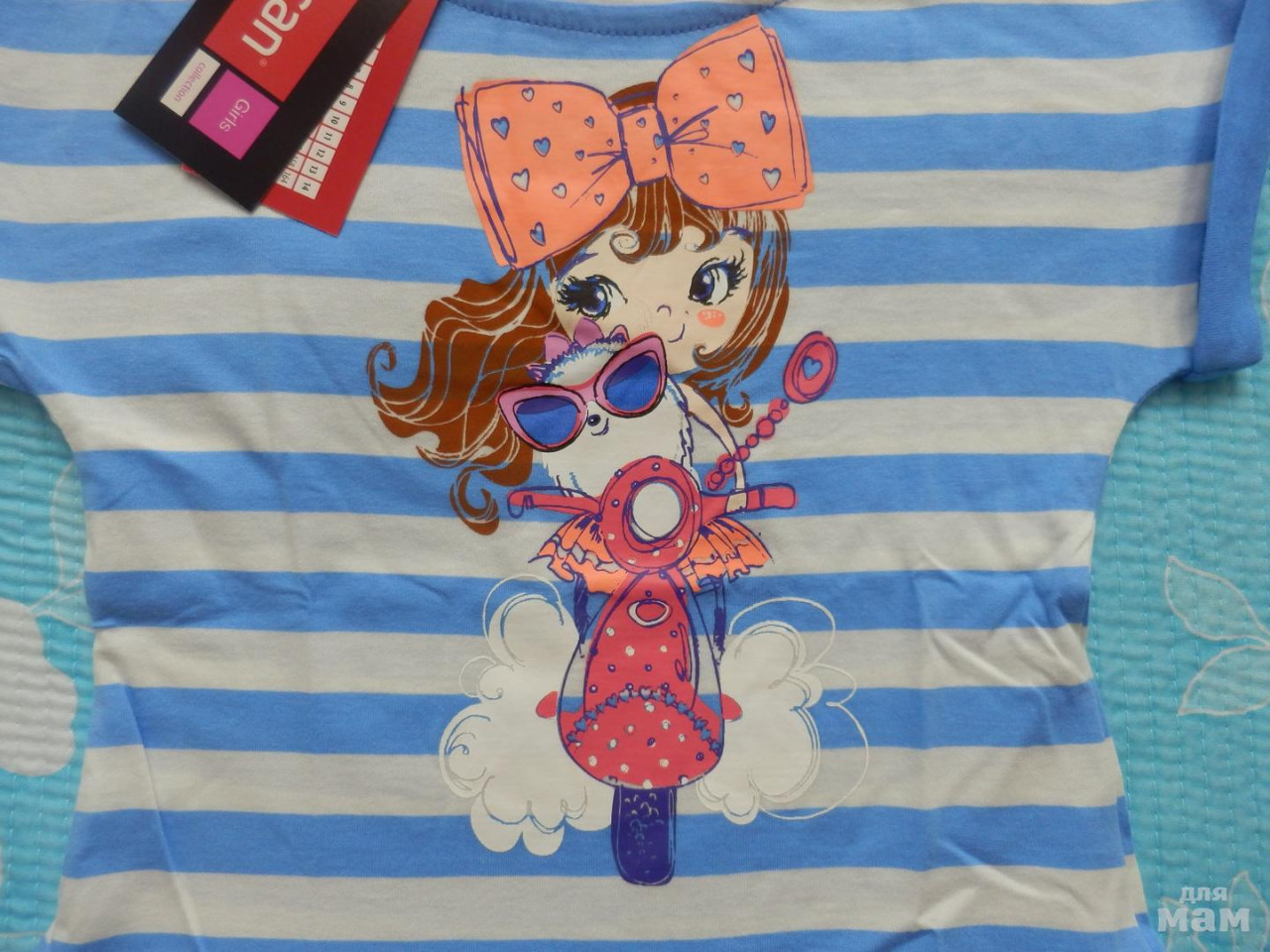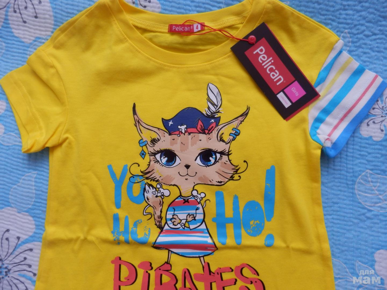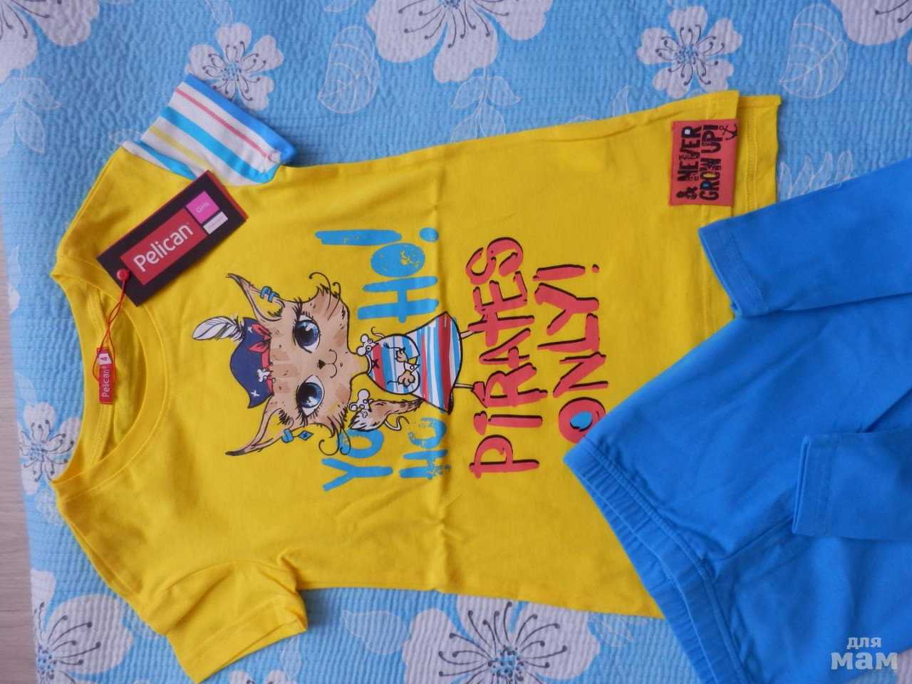 Комплект с бриджами из прошлой коллекции. Симпатичная кошка -пиратка. Очень удивил левый (полосатый) рукав. Качество хлопка, как всегда, отличное.