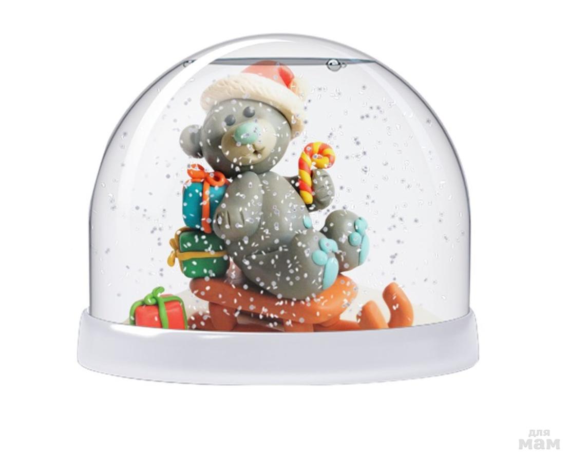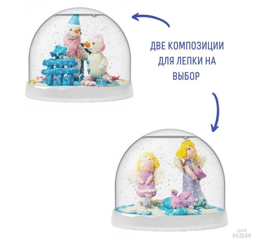 В наборе: подробная инструкция, сферическая основа для шара, цветной пластилин, доска для лепки, подставка для композиции, специальные жидкости, блёстки для создания снежного эффекта.