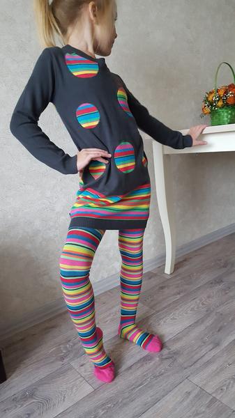 К этому платью у нас классные колготки. Цвет глубокий серый, почти синий (темный). Эта модель нам с запасом, на мой взгляд большимерит, НО мы за лето сильно похудели, может в этом причина.