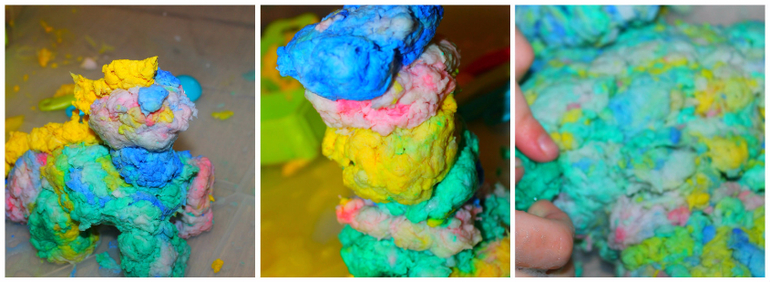 Как сделать: все смешать, добавить краситель по желанию. На одну пачку крахмала (200 гр.) одна треть баллона пены.