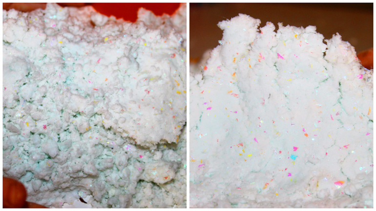 Как сделать: смешать ингредиенты, в соотношении 1:3 (соды больше). На один баллон пены понадобится полторы пачки соды, для бОльшего «волшебства» можно добавить немного блесток.