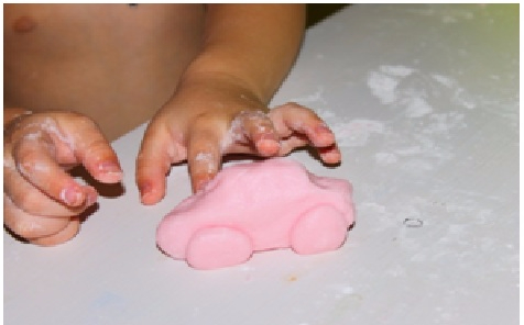 Что понадобится: мука, детское масло (Джонсонс Бэби), цветной мелок для придания цвета (по желанию)