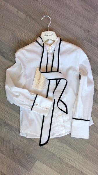 - РУБАШКА С БАНТОМ. 9 лет (134 см). Состав: 68%cotton,30%нейлон,2%эластан. Замеры: шир.по спинке-29-30см, длина от воротника по спинке-48см, дл.рукава-48см. ЦЕНА: 5600 руб.