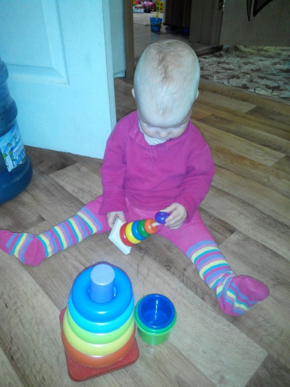 Мы очень любим эту игрушку,впервые разбирать её мы стали в 10 месяцев,а собирать научились к 11.Но проблема в том,что моя дочь не умеет её собирать правильно по размеру,она выстраивает композиции какие хочет.Моя главная цель была познакомить её с пирамидкой так,чтобы обратить внимание на то,как правильно её собрать.Плюс затронуть размер,понятие "маленький-большой".