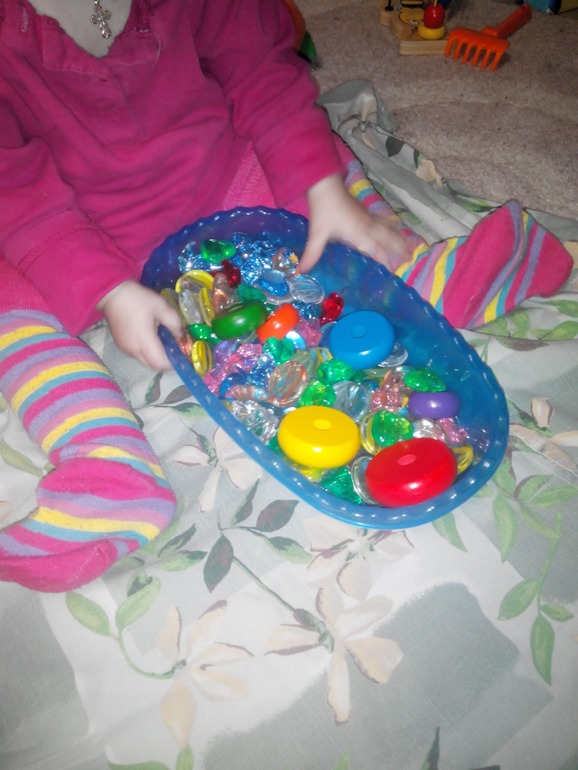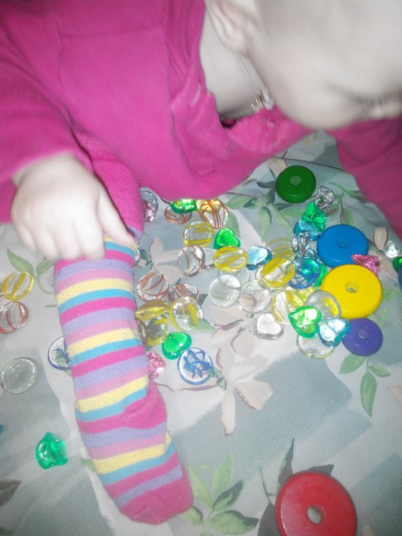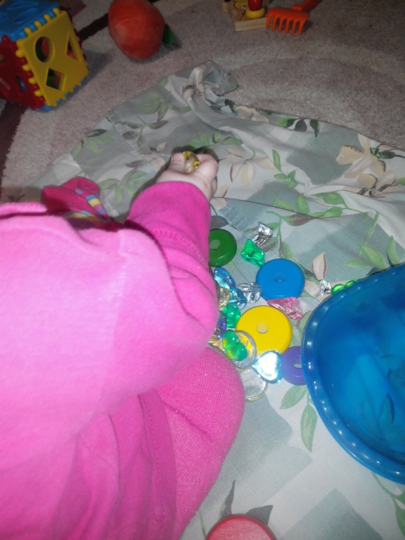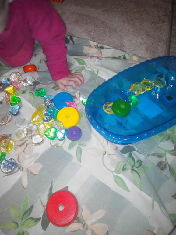 Играли мы с ней очень весело,перебирали камушки,закапывали колечки,перекладывали их.И в рот тянули,правда,что удивительно, не сразу,а спустя минут 10.